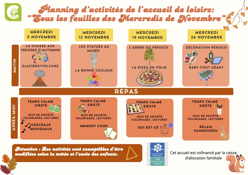 « Sous les feuilles des mercredis de novembre » pour celles et ceux qui viendraient partager les moments de pause de la semaine d’école au centre de loisirs de Cercoux.
