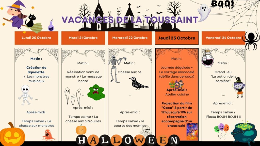 Sorcières, petits monstres et citrouilles magiques se préparent à vivre une semaine pleine de surprises, d’activités et de rires… 🎃🕷️