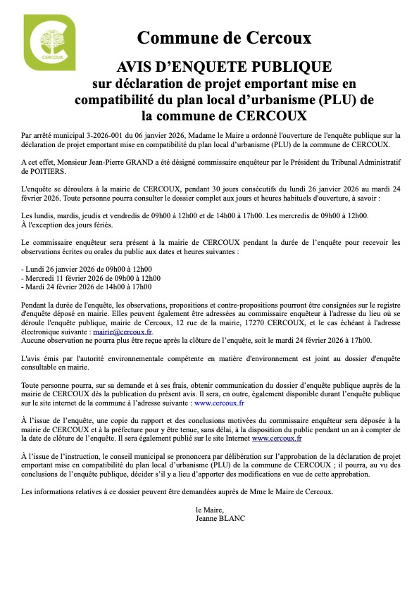 Si vous avez des questions, vous pouvez joindre l’accueil de la mairie par mail (mairie@cercoux.fr) en indiquant bien dans l’objet de votre mail : PLU – Enquete publique de déclaration de projet.